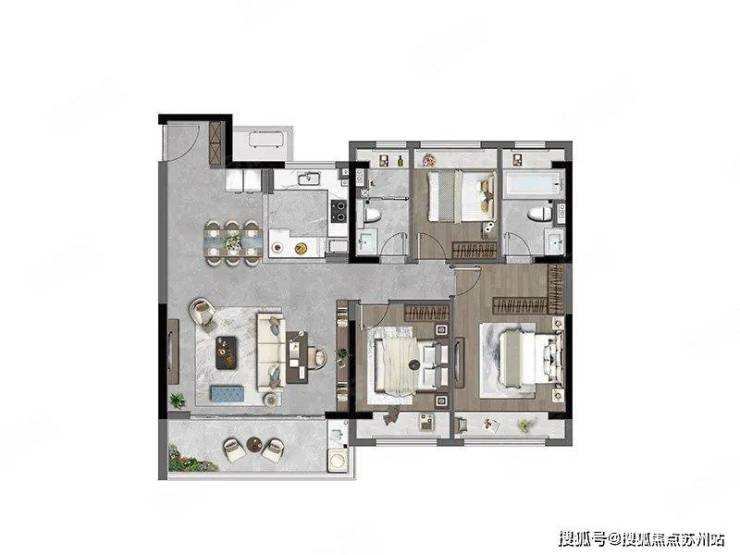 这个四开间朝南户型,全卧配备飘窗,采光优胜。从卧套房设想,敞阔空间,私密性取感并沉。外卫干湿分手,卫生间,日常利用效率高。餐客厨一体,超大厨房空间,容纳多人操做。设白叟房,满脚多元家庭布局。